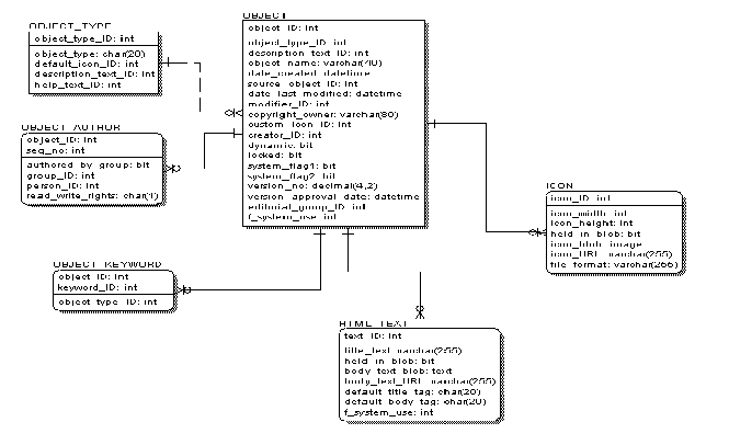 Although MS SQL Server V6.5 is a relatively standard relational database system, the Creator design built upon it, is really an Object-Relational system, enacted via custom-coded Java classes which use the JDBC interface to SQL Server tables. There are 15 internal Creator object types that are fully catered for within the Creator system, as follows: