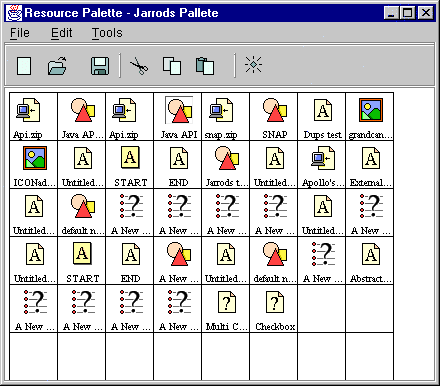 At a certain basic level, all objects are equal within the Creator system. Figure 3 represents a screen-shot of the Resource Palette, which is one of the tools within the Creator Authoring Tools package [5], written in Java V1.1. The different icons represent different object types, while specific individual objects have individual names. Though the view seen here is a grid-layout view, the user may flip to a table view of resources, in which each object occupies one whole line of the display, allowing the user to inspect more detailed object information. In addition, a property-sheet window may be popped-up via the right-mouse button for any object within the current Resource Palette, to inspect the full property details of an object - including recursive references to embedded sub-objects (e.g. an Image within a Page within a Reference-work).