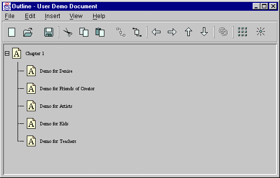 A Creator Reference-work is a hierarchical arrangement of pages. A Creator Page object is equivalent to an HTML page, from the browsers point of view. However, unknown to the browser, such pages are dynamically constructed behind the scenes from other objects, both simple and complex ones. So a hypermedia online book or even an encyclopedia with images, sounds, animations, applets and videos, placed throughout the text, can be constructed within Creator as a single Reference-work. Figure 4 below, is a screen-shot of the deceptively simple opening screen of The Outliner, the built-in authoring tool used to create and edit a Reference-work. Each node on the Outliner tree represents a Page object, equivalent to a HTML page - the basic building block of the Web.