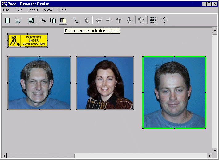 Creators Learning-activities and Reference-works can be thought of as two styles of online interactive documents, each made up of numerous related pages. The Page object has special significance within Creator, in that it is outwardly equivalent to an HTML browser page. Fig. 6 below, is a screen-shot of Creator's WYSIWYG HTML V4 editor, the Page Designer. It allows the user to drag-and-drop all object types which can have a rectangular representation on-screen, i.e. HTML-text boxes, HTML-table, Image, Video and External-Object types including: Java Applets, JavaBeans, Shockwave and ActiveX controls.
