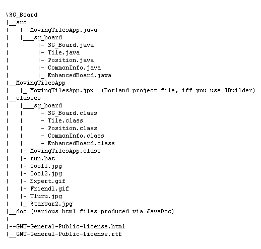 If you use Borland's JBuilder then there is a project file for running and compiling the project, in the sub-directory: SG_Board\MovingTilesApp