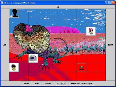 The SG_Board 2D board-game engine or package in Java parlance, includes two main classes: the SG_Board class and the Tile class, together with several auxiliary classes. Figure 1 above represents a small demonstration application of SG_Board, supplied with the package, but which is not a complete game. It simply shows the basic functionality, or the atomic moves available in the class, using a minimal amount of code to do so - in order to get you up and coding with it, as soon as possible. Here is a description of what you see in Figure1, and how you interact with the example program, which is simply called MovingTilesApp: