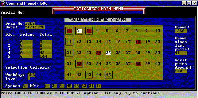 Note: We still sell (for $33 plus shipping) a significantly improved Microsoft Windows version called "LottoCheck INFORM V2 for Windows", which runs under MS Windows V3.1, Windows 95, Windows 98 and Win NT, and which is only available directly from:
