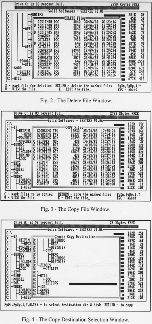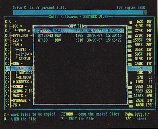 Figure 0 shows V1.06 from 1988 - the first version of SeeTree released for sale. While it allowed the user to easily locate, Copy, Edit, View or Delete files, other options were quickly added, including: Transfer files to another location, reName files, eXecute files; and at the directory level, create sub-directories (with MkDir) and rename sub-directories (RmDir). Plus the ability to take the currently highlighted file into a number of applications of the users choice, dependent on its file extension (e.g. .doc goes to MS Word), via a simple configuration file - making SeeTree one of the first file-to-application 'document-centric' File Managers available.