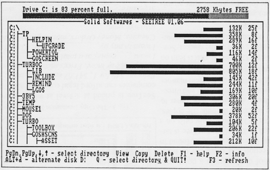 Executive Summary: SeeTree visualises the directory structure of disks in MS/DOS (aka PC/DOS) computers, and also visualises the amount of disk/storage space used by each and every sub-directory by way of a bar-graph. [Note: This page is largely an historical entry, since we first published SeeTree in 1988 and have not sold the app since the 1988-1991 period when MS/DOS and PC/DOS computer were still quite prevalent on desktop computers. After MS Windows computers became dominant on the desktop with MS Windows V3.1, people tended to use Windows Explorer to do many of the things one could do with SeeTree on MS/DOS. However, the visualisation of disk usage spread between directories, and the User Experience inherent in the interface of SeeTree with intuitive key-stroke usage, remained superior to Windows Explorer. Note: However, we may re-release it as a retro-app on smart devices at some point in the future, where storage space and management is once again an issue concerning end-users.]